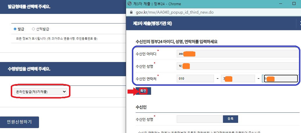 수령방법을 본인출력이 아닌 온라인발급(제3자제출)을 클릭하시면 오른쪽의 화면이 나오게 됩니다