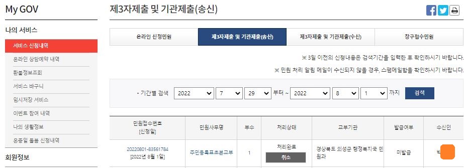 이후 민원신청하기를 하면 제3자제출 및 기관제출(송신)에서 내가 보낸 초본이 상대방에게 갔는지 확인이 되고