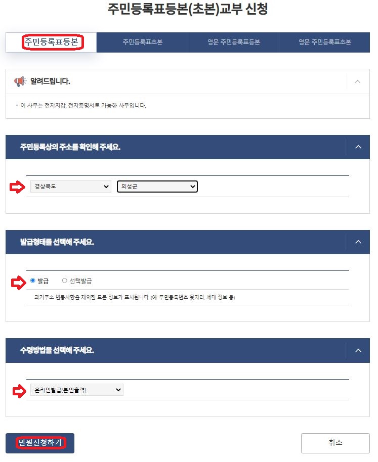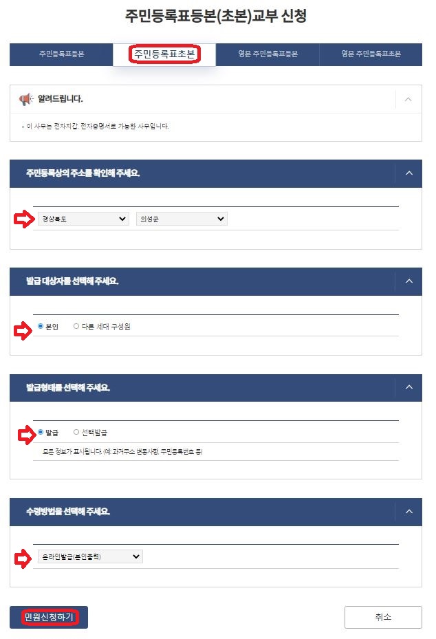 여기서는 등본을 발급할 것인가/ 초본을 발급할 것인가를 선택해야합니다