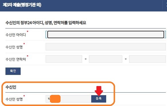 눌리시면 밑에 수신인 성명이 나오게 되는데 등록 버튼을 꼭 눌리셔야 합니다!!